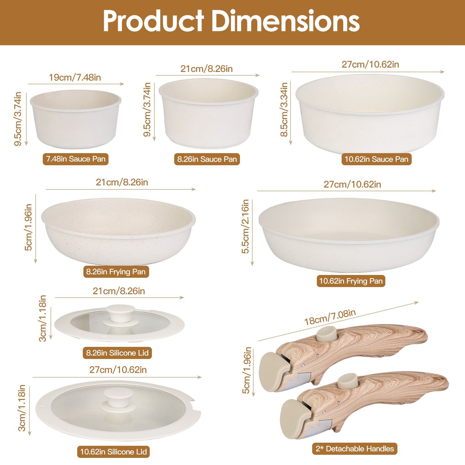 *9Pcs Complete Cookware Set*:Our 9Pcs complete cookware set comes with 7.48in/8.26in/10.62in sauce pan,8.26in/10.62in frying pan,2* removable handles and 2* matched lids. You can get all kitchen cooking essentials in one package,which easily satisfy various daily cooking demands for you and your whole family.