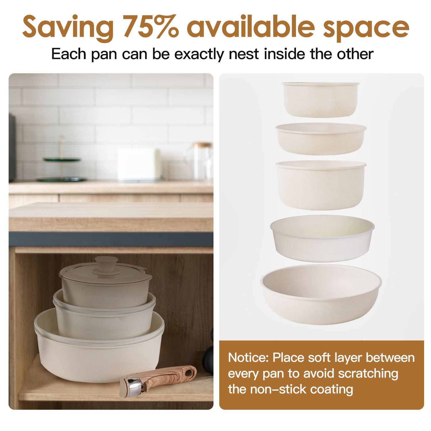 *Non-Stick Granite Coating*:Advanced granite coating technology is free of toxic chemicals and effectively prevents food from sticking. Due to its excellent non-stick performance,you can use less oil to make much healthier food in your daily life. Moreover,each pan can be exactly nest inside the other,saving available space when storage. Just pay attention to place soft layer between every pan to avoid scratching the non-stick coating.