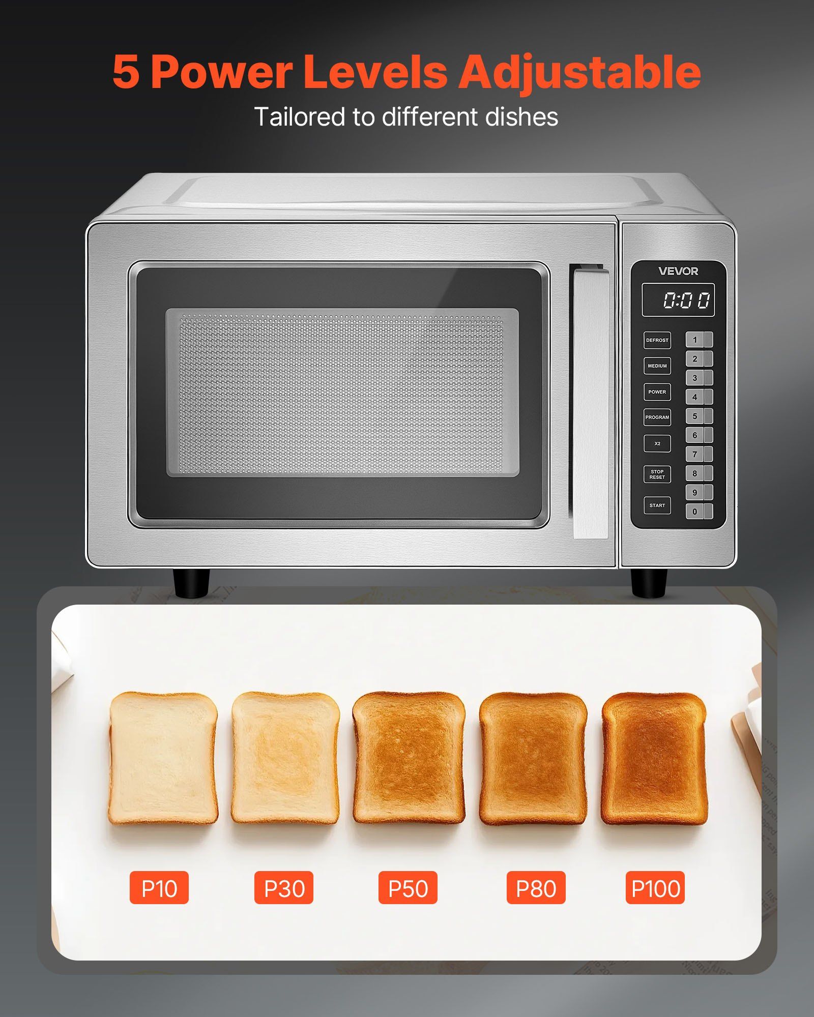 4.Adjustable Heating Power: This stainless steel countertop microwave supports five adjustable power levels, allowing you to customize heating temperature according to food usage requirements. It avoids overheating and burning, and improves food taste